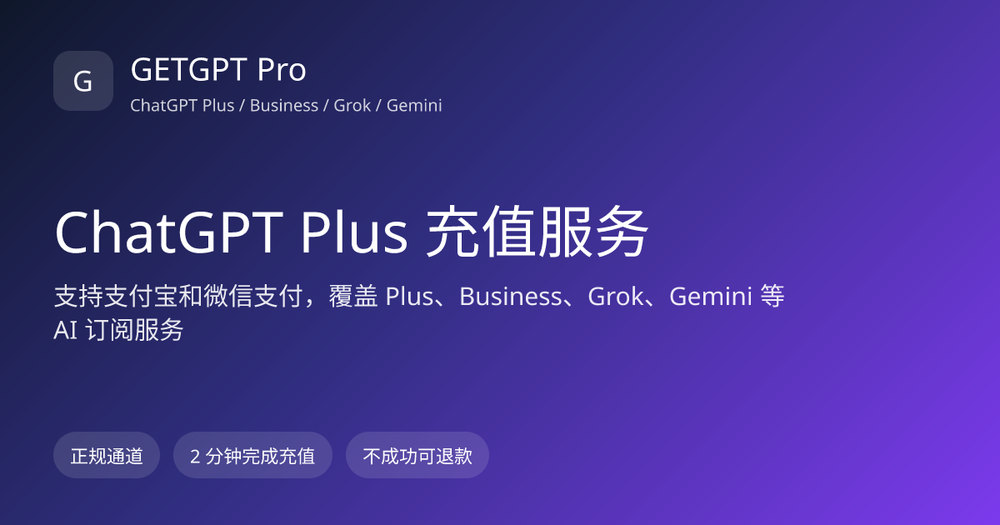 GETGPT Pro 是一家专业的 AI 服务充值平台,致力于为用户提供安全、便捷的 ChatGPT Plus 和 Pro 升级方案。通过正规的充值通道,用户无需准备海外信用卡或处理复杂的开卡流程,即可在 2 分钟内完成账号升级,享受 ChatGPT 的全部高级功能。